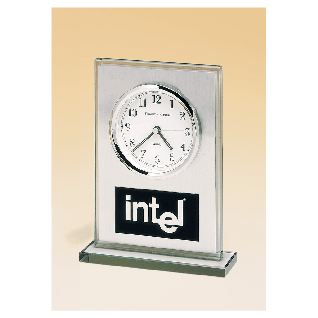 Glass Clock with Brushed Aluminum Panel, a sophisticated 7-inch timepiece featuring a precision quartz movement housed within a sleek glass and brushed aluminum design. The minimalist aesthetic combines modern materials with functional elegance, making it an ideal accent for contemporary spaces. Perfect for desks, shelves, or wall mounting, this clock delivers both reliable timekeeping and understated style.