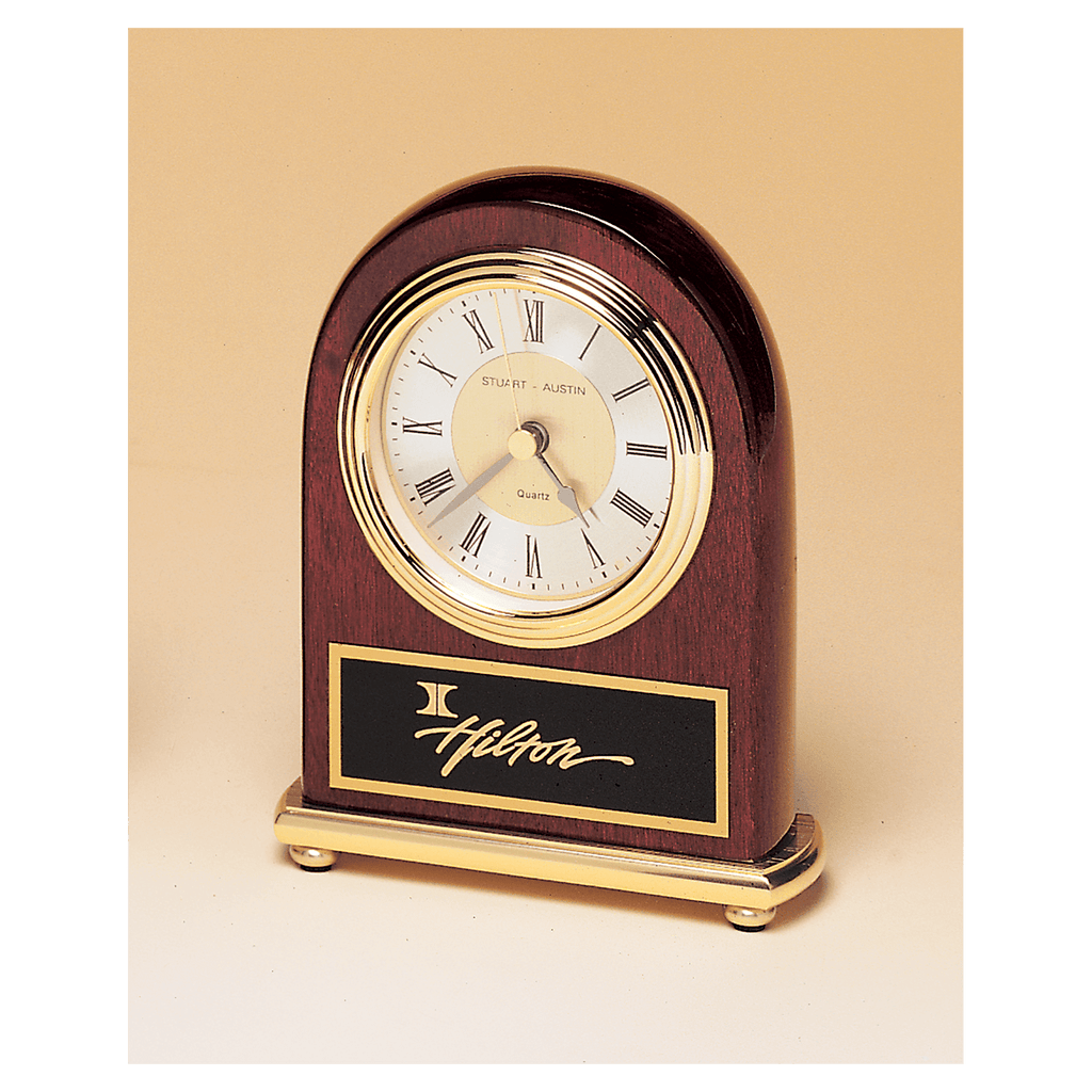 Rosewood Finish Arch Clock with Brass Base This elegant 5" tall timepiece combines classic design with refined craftsmanship. The warm rosewood finish pairs seamlessly with a polished brass base, creating a sophisticated accent for any desk, shelf, or mantelpiece. The arched silhouette adds architectural interest while maintaining a compact footprint. Precision quartz movement ensures reliable timekeeping. An ideal recognition piece for corporate settings, awards ceremonies, or as a distinguished gift for the discerning professional.